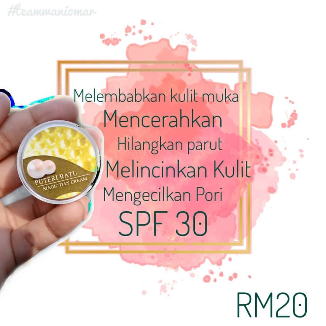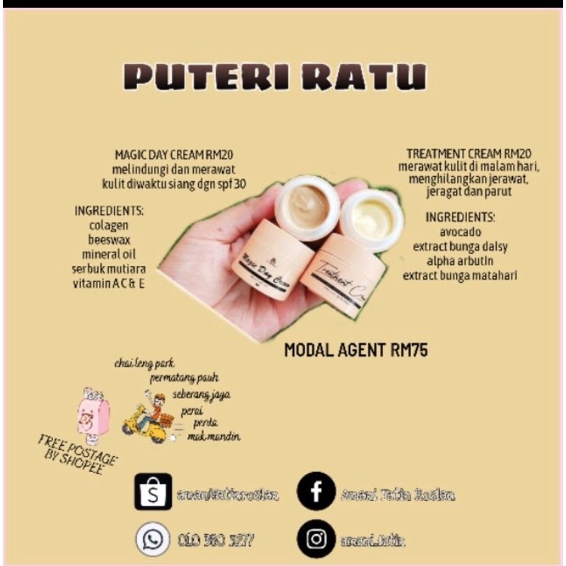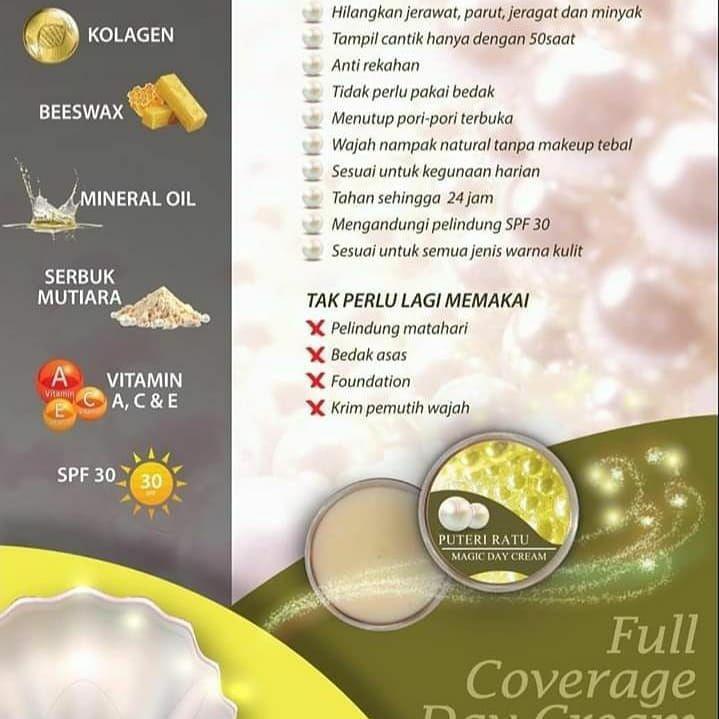 Puteri ratu HQ, Bukit Mertajam 18,842 likes · 569 talking about this · 7 were here TREATMENT CREAM MAGIC DAY CREAM. Queen herb set shampoo & treatment 1;. MAGIC DAY CREAM by PUTERI RATU MAIN MATERIAL ️ COLLAGEN ️ BEESWAX ️ MINERAL OIL ️ PEARL POWDER ️ VITAMIN A, C & E ️ SPF30 All of these ingredients are safe and no peeling materials ☺ KINDNESS 🍃 Not oily 🍃 Not cracking 🍃 Not sticky 🍃 Light texture 🍃 No need to put on powder 🍃 Treat acne, scars, acne and oily skin 🍃 Face looks natural without thick makeup 🍃 Contains SPF30 🍃 Suitable for all skin tone types 👉🏻 Suitable for all skin types.