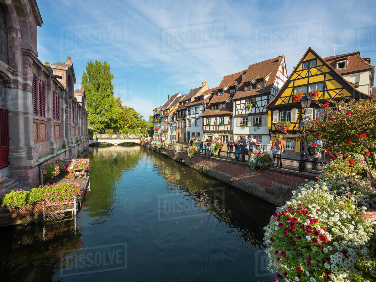 France Alsace Colmar View Of La Petite Venise Quarter Half Timbered Houses On Canal Stock Photo Dissolve
