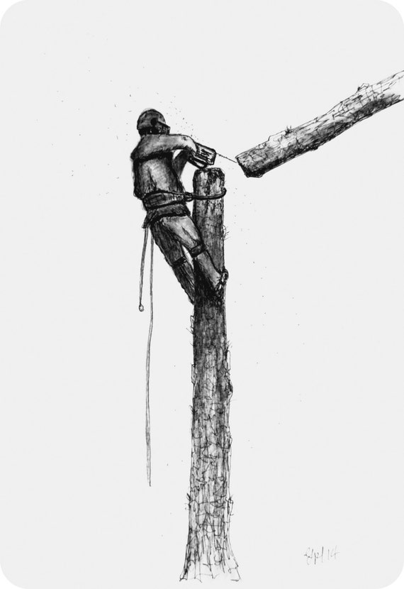 Print Of A Arborist Felling Stihl Lumberjack Etsy Tree Surgeons Arborist Tree Drawing