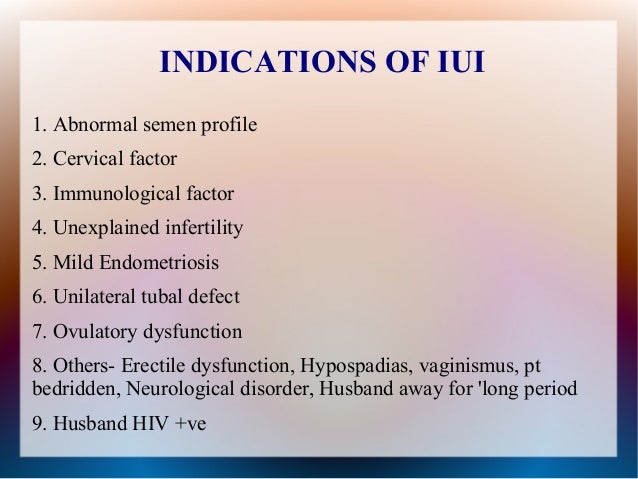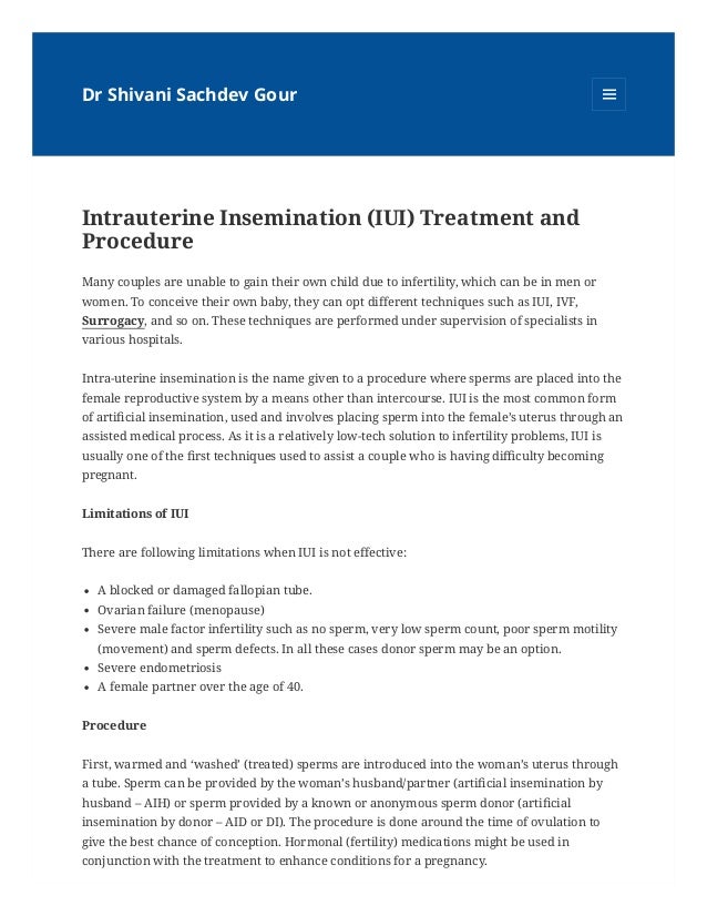 Intrauterine insemination is a fertility procedure in which sperm are washed, concentrated, and injected directly into a woman’s uterus The most common indications are cervical mucus abnormalities, low sperm count, low sperm motility, increased sperm viscosity or antisperm antibodies, unexplained infertility. Intrauterine insemination (IUI) — a type of artificial insemination — is a procedure for treating infertility Sperm that have been washed and concentrated are placed directly in your uterus around the time your ovary releases one or more eggs to be fertilized. Intrauterine insemination (IUI) is a procedure where male partner’s semen is collected first That semen sample has to be processed because raw semen has prostaglandins and they can cause severe uterine cramping and contractions and cannot be used for IUI By washing the semen sample, seminal plasma and prostaglandins are removed and sperm.