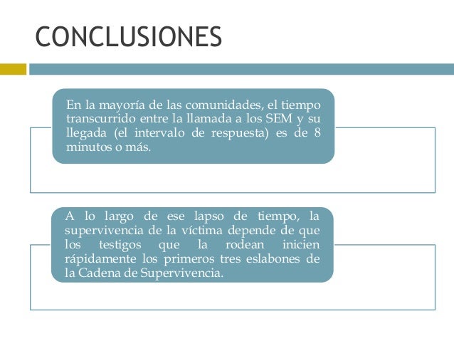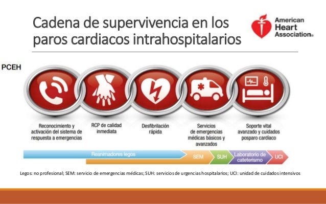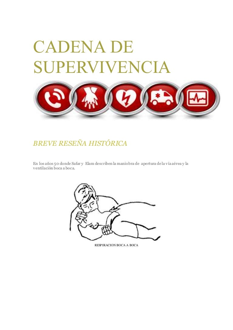 Cuando alguien sufre una parada cardíaca fuera del hospital, existe una cadena de eventos que pueden ayudar a aumentar las posibilidades de supervivencia Esto se conoce como el Concepto de Cadena de Supervivencia Un término acuñado por la American heart Association en 1991, la cual en su documento ‘Improving Survival from Sudden Cardiac Arrest The. Índice1 Resumen11 Introducción12 Conclusiones2 Objetivo3 Metodología4 Desarrollo41 Primeros pasos, la cadena de supervivencia y el sistema PAS para primeros intervinientes411 Proteger412 Avisar (112 – Central Operaciones Emergencias)413 Socorrer5 Bibliografía Facebook Twitter LinkedIn Incluido en la revista Ocronos Vol III Nº 8– Diciembre Pág Inicial Vol. La cadena de la supervivencia se compone de acciones en un orden determinado con el fin de socorrer a una personaEs un procedimiento para aumentar las posibilidades de vida frente a una parada.