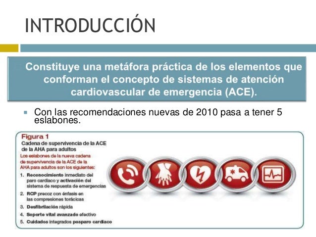 Cadena de supervivencia de la ACE de la AHA para adultos Los eslabones de la nteva cadela de supervivencia de la ACE de la AHA para adultos siguientes I inmediato del paro cardiaco y activación del sisterna de respuesta de emergencias RCP precoz con énfasis en las cnpresiones torácicas Desfibrilación rápida 4 vital avmzado. Explica la “cadena de supervivencia” 1 Ver respuesta alfredocossio está esperando tu ayuda Añade tu respuesta y gana puntos ana5727 ana5727 Respuesta La cadena de supervivencia es el conjunto de acciones dirigidas a salvar la vida de las personas que se encuentran en parada cardiorrespiratoria. LA CADENA DE SUPERVIVENCIA Las acciones que unen a la víctima de una parada cardiaca súbita a la supervivencia se denominan Cadena de Supervivencia El primer eslabón de esta cadena indica la importancia de reconocer a las personas en riesgo de parada cardiaca y llamar pidiendo ayuda con la esperanza de que el tratamiento precoz pueda.