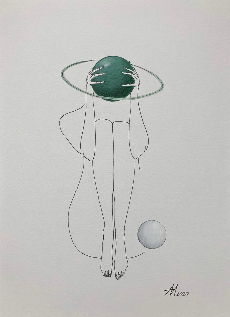 Mila Akopova Green Saturn Line Drawing Woman Figure With Circle For Sale At 1stdibs