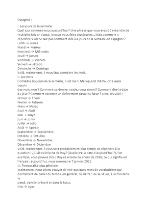 Start studying Les mois en Espagnol Learn vocabulary, terms, and more with flashcards, games, and other study tools. (jour après dimanche) lunes nm inv nombre masculino invariable Sustantivo masculino que tiene la misma forma en singular y en plural El artículo masculino muestra la diferencia entre plural y singular Ejemplos el apocalipsis, los paréntesis Le lundi est le premier jour de la semaine dans les sociétés occidentales. Los días = les jours El día siguiente = le jour suivant La semana = la semaine La semana pasada = la semaine dernière La próxima semana = la semaine prochaine El mes / Los meses = Le mois / Les mois En el futuro = dans le futur Es de día = il faut jour Amanece = le jour se lève La ma ñana = le matin La tarde = l’aprèsmidi.