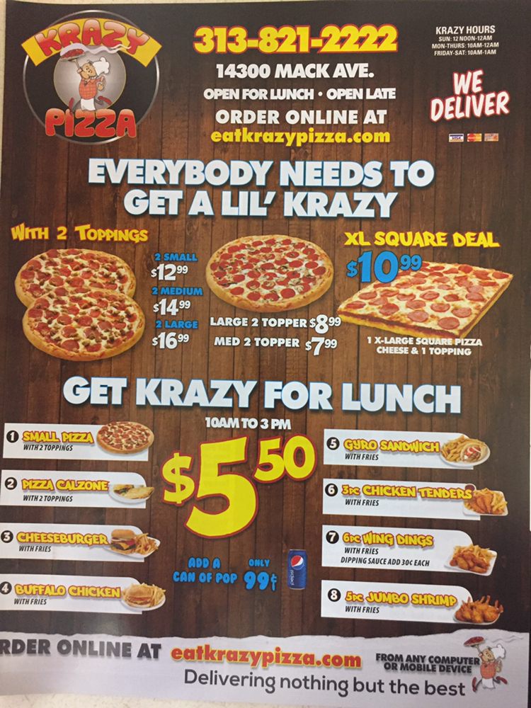 View Krazy Pizza menu, located at Mack Ave, Detroit, MI 415 Find the closest local pizzerias that deliver on Slice. Good pizza crust in a pinch when you don't have yeast I will make it again but will only use 1 egg (it tasted a bit like an omelette with pizza toppings)) Also we were only using cheese so I baked it by itself for 15 minutes in the preheated oven then turned it over and put on the toppings Baking it longer would have probably burned the crust. Located at 299 Malcolm X Blvd, Brooklyn, NY We offer a wide array of fresh food – pizzas, chicken salad, onion rings, cheese burger, wings and tenders We use the freshest ingredients in preparing our food to provide the best quality and taste Try our delicious food today!.