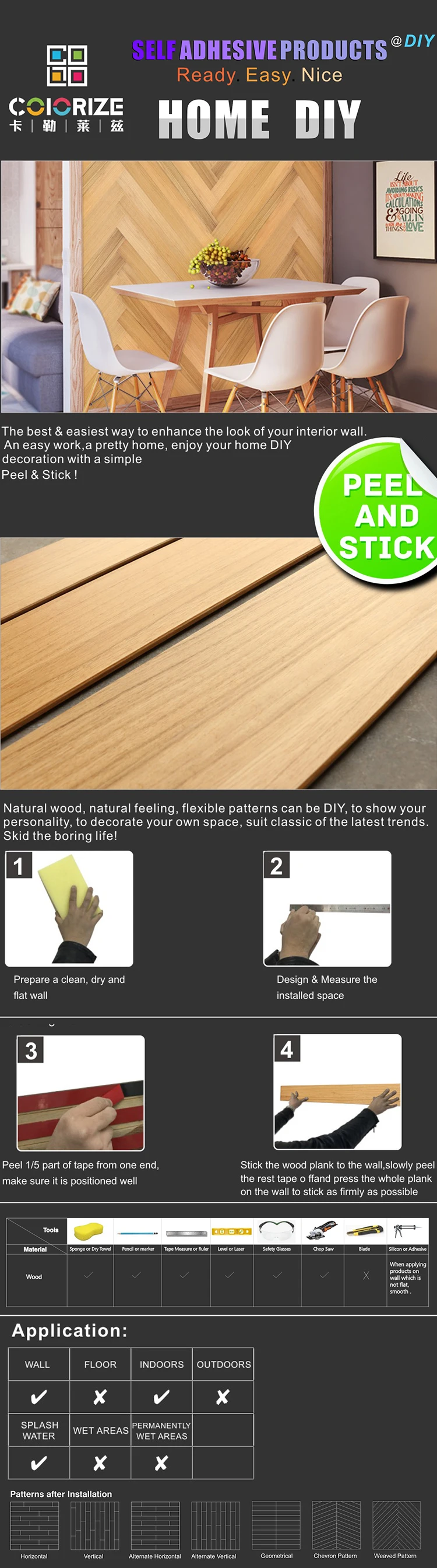 Peel and stick wood wall planks are designed to make home remodeling an exciting and easy process At WoodyWalls we always focus on beautiful designs as well as sustainability;. Wood wall planks are durable, stylish, and easy to install These products are designed specifically to be used on walls and require little to no maintenance These wood panels come in planks and panels, of which some are applied through peel and stick wood wall sheets while others are applied by glue. Get Your Wall Ready You'll need a clean, smooth wall to start Before applying the Stikwood, scrape any excess paint or wallpaper that could prevent panels from adhering evenly The surface must be flat, so remove any screws, nails or wall plates extending from the wall.