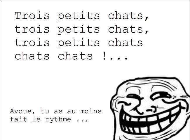 Phonétiquement à un autre (trois petits chats>>>chapeau de paille), qui à son tour renvoie à un autre (paille>>>paillasson), et ainsi de suite jusqu'à revenir au groupe de départ (guerre de troie>>>trois petits chats) De mème qu'il y a les charades, les virelangues et autres. Trois Petit Chats , by Supinfocom 3D animated short film. La comptine "3 petits chats" pour les enfants Paroles Trois p'tits chats, trois p'tits chats, trois p'tits chats, chats, chats, Chapeau d' paille, chapeau d' paille, chapeau d' paille, paille, paille,.