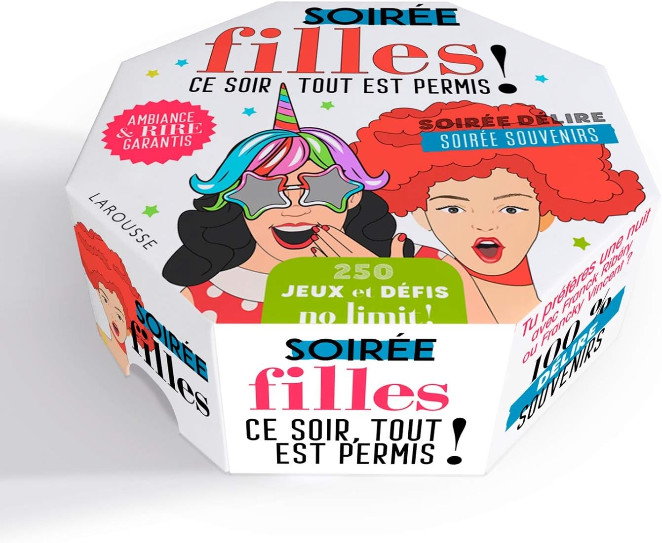 Ce soir, tout est permis !. Soirée filles aux éditions Larousse 250 jeux et défis no limit !. Pour un anniversaire, une soirée ou un enterrement de vie de jeune fille, dans tous les cas le programme sera chargé !Comme on a hâte de se retrouver toutes ensemble pour refaire le monde accompagnées de nos acolytes de potins !Forcément entre filles on aborde tous les sujets mode, coiffure, potins, amour, anecdotes.