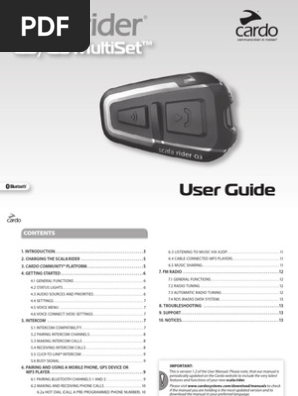 (26) 26 product ratings Cardo Scala Rider Q3 Multiset Motorcycle Motorbike Bluetooth Intercom Headsets AU $ AU $4345 postage 85 sold Cardo Scala Rider Smart Pack Communication and Entertainment System 45 out of 5 stars (3) 3 product ratings Cardo Scala Rider Smart Pack Communication and Entertainment System. English 1 INTRODUCTION Congratulations, and thank you for choosing the scala rider G4 Bluetooth® communication system for motorcycle helmets This manual will help you operate the G4, but you should first familiarize yourself with the Bluetooth functionality of your mobile phone and/or GPS device before using the G4 The retail box of the G4 contains one G4 unit. BiketoBike Intercom up to 1 km range The scala rider® Q3 makes riding in small groups really fun!.