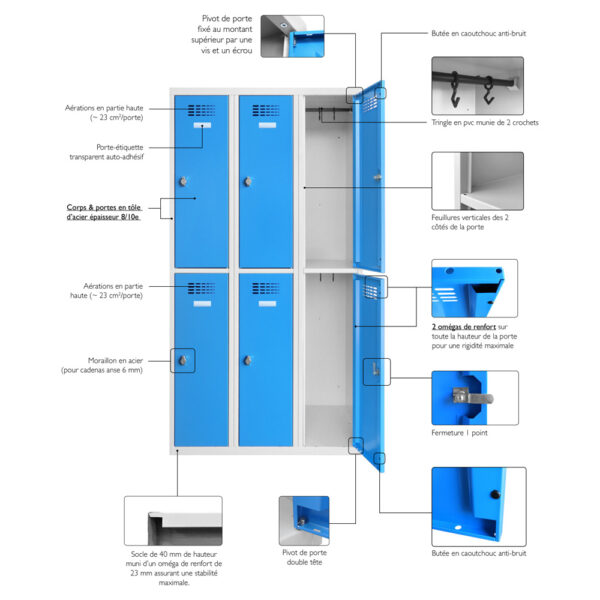 Vestiaire armoire de rangement multisport pour équipements destinée aux écoles et aux gymnases Cette armoire multisport est équipée de 2 étagères simple avec butée d’arrêt, de 6 crochets simples et 4 crochets doubles pour raquettes, cerceaux, etc Portes battantes perforées avec oméga de renfort, ouverture à 180°. Connectezvous pour personnaliser les maillots de votre équipe (foot, rugby, volly, hand). Salle de sport Collège/lycée Collectivités Entreprises Avis sur le produit Déposez un avis sur Vestiaire sport 2 casiers sur la hauteur colonne largeur 300 mm Votre réponse à l'avis de.
