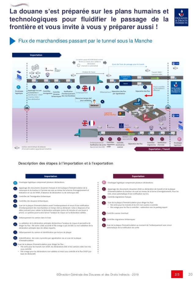 The export accompanying document is a formal export declaration to domestic customs which fulfils two main functions in particular On the one hand, it serves the statistical recording of flows of goods for foreign trade statistics and, on the other hand, the control of prohibitions and restrictions in foreign trade. Douane éventuel Embarquement et Notification de sortie Apurement des EAD Séparation des flux 8 Transit / BAE / Camions vides Transit hors SIVEP Autre Douane SIVEP Déclarants 7 Flux à contrôler ou formalités à effectuer Le camion passe et le déclarant a entre 40 min à 1 heure pour valider la déclaration (manuel ou automatisé) Import. A thorough explanation of these documents can be found in.