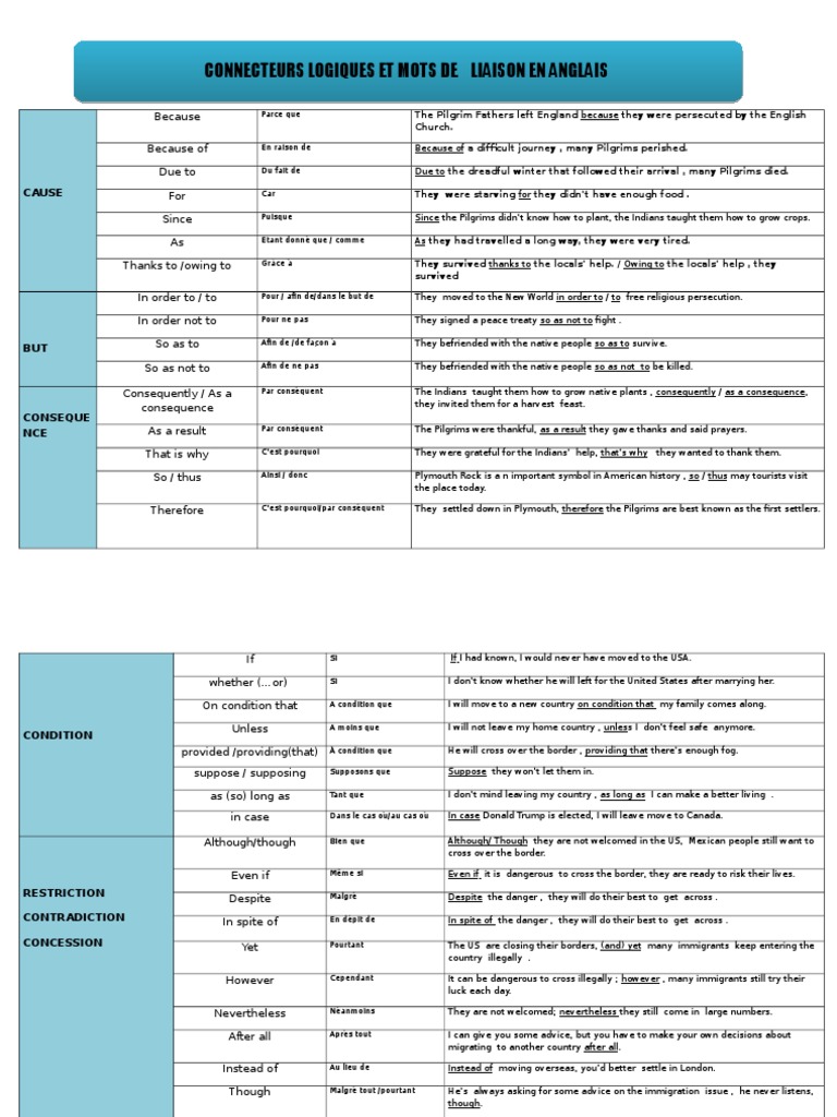 Les mots de liaison en anglais ou connecteurs logiques sont ces mots insérés dans un corps texte pour préciser la construction de la narration d’un récit Ce sont les jointures qui permettent d’articuler une phrase en anglais. Apprendre du vocabulaire anglais Moreover d e pl us What is more qu e pl us es t, bien p lu s By the way s oit d it en p assan t In addition to de s u rc r oit, e n o utr e In fact e n f ai t In other words en d 'a u tres te rmes That is to say c 'e s tà di re. Connecteur logique but for pour in order to afin de so that de sorte que so as to ( verb) afin de for this purpose à cet effet to this end à cet effet Connecteur logique cause because parce que because of à cause de as comme thanks to grâce à for car due to dû au fait que on account of étant donné que.
