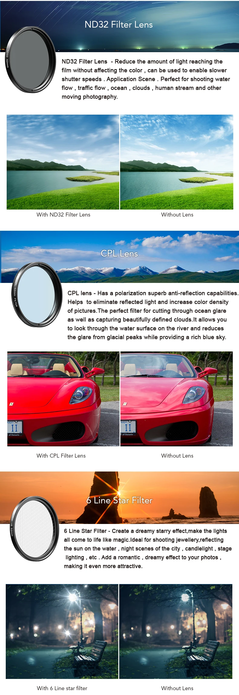 This lens kit has everything you need 063X wide angle lens & 15X macro lens, 2X telephoto lens, 198°fisheye lens,kaleidoscope lens,CPL filter,flow filter,radial filter and star filter ENHANCED PHOTOGRAPHY Fisheye Lens create funny circular pictures Wide Angle lens allows you to capture larger scenes and group shot. Find the right filter size for your camera We have created the most expansive filter to camera guide chart on the entire Internet for FREE!. This lens kit has everything you need 063X wide angle lens & 15X macro lens, 2X telephoto lens, 198°fisheye lens,kaleidoscope lens,CPL filter,flow filter,radial filter and star filter ENHANCED PHOTOGRAPHY Fisheye Lens create funny circular pictures Wide Angle lens allows you to capture larger scenes and group shot.
