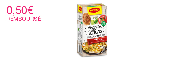 Pour réaliser vos buns aux Mélanges Parfaits Italien et au fromage de MAGGI®, suivez les étapes de la recette, cidessous Régalezvous avec les buns aux Mélanges Parfaits Italien et au fromage de MAGGI® un vrai délice !. Le produit vendu sachet refermable de mélange italien (p oids au choix) Il se marie parfaitement avec tous les plats à base de tomate (bolognaise, pizza, ratatouille), toutes sortes de légumes et de viandes, bref, dans toute la cuisine méditerranéenne !. Mélanges Parfaits Italien Mélanges Parfaits Italien Terminée0,50€ * sur votre achat 1,70€ * Mélanges Parfaits Italien Au rayon bouillons et aides à la cuisine téléchargez l'application téléchargez l'application Pour voir les magasins autour de vous, vous devez activer la géolocalisation.