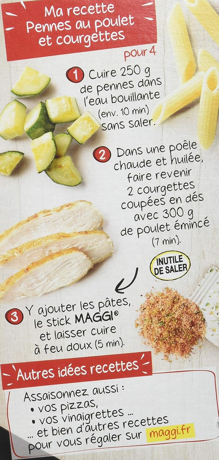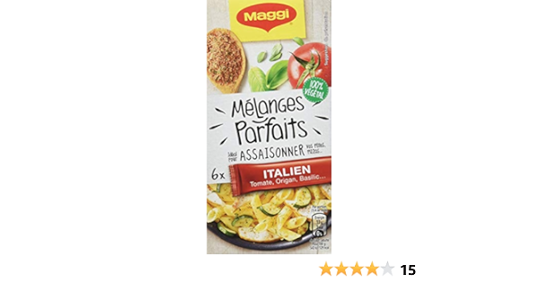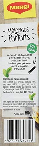 Maggi Mélanges Parfaits est un mélange unique d’herbes, épices, sel et aromates dans un format en stick prédosé qui garantit le juste assaisonnement pour donner un délicieux goût typé à tous les plats du quotidien Le mélange Italien au bon goût de tomate, origan et basilic se marie très bien avec des plats de pâtes, des pizzas, bruschetta permet d’avoir la juste dose d.