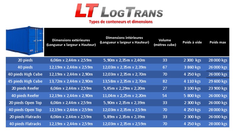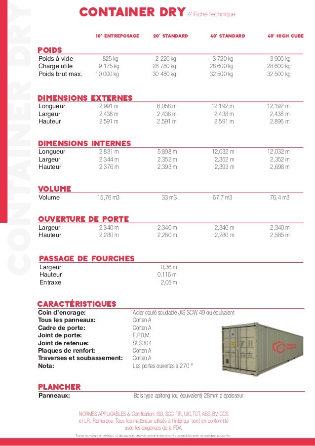Conteneurs Standards Pieds Dimensions extérieures 606m x 244m x 259m Dimensions intérieures 590m x 235m x 240m Volume 33 Poids à vide 2 300kgs Poids maximum 28 000 kgs 40 Pieds Dimensions extérieures 1219m x 244m x 259m. 10 Pieds ≈ 3m. Pieds ≈ 6m;.