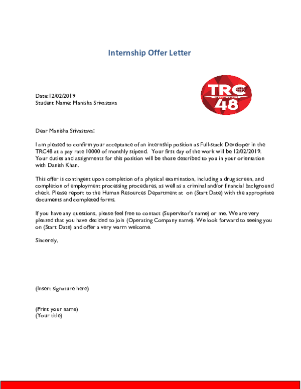 Telecharger Gratuit Internship Offer Acceptance Letter