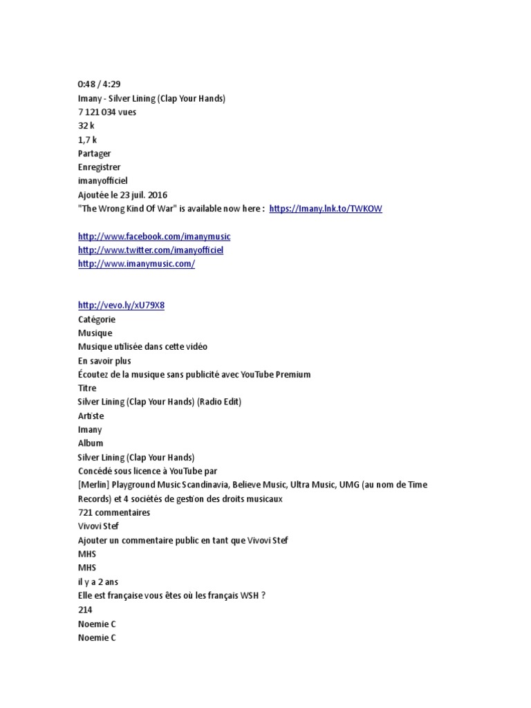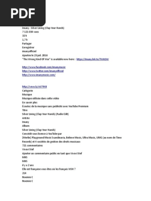 Titres les plus populaires de Imany MORCEAU ARTISTE Don't Be So Shy (Filatov & Karas Remix) Don't Be So Shy (Filatov & Karas Remix) Imany Imany 15,445,968 You Will Never Know You Will Never Know Silver Lining (Clap Your Hands) Imany Imany 530,571 You Will Never Know (Ivan Spell & Daniel Magre Radio Mix) You Will Never Know (Ivan. Paroles du titre Silver Lining (Clap Your Hands) (Traduction) Imany avec Parolesnet Retrouvez également les paroles des chansons les plus populaires de Imany. Talkwalker free social media search La Free Social Search est un moteur de recherche en temps réel pour le web et les réseaux sociauxSuivez les discussions autour de votre marque, vos campagnes, vos hashtags ou vos évènements dans le monde entier au cours des 7 derniers jours Talkwalker's Free social search monitors every conversation about your brand, hashtags and competition on social.