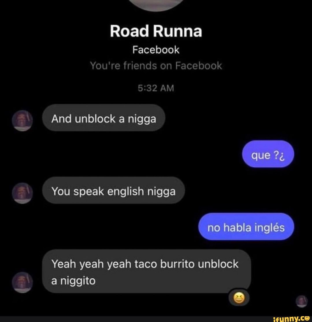 Road Runna Facebook You Re Friends On Facebook Am And Unblock A Nigga Que You Speak English Nigga No Habla Inglss Yeah Yeah Yeah Taco Burrito Unblock A Niggito Ifunny