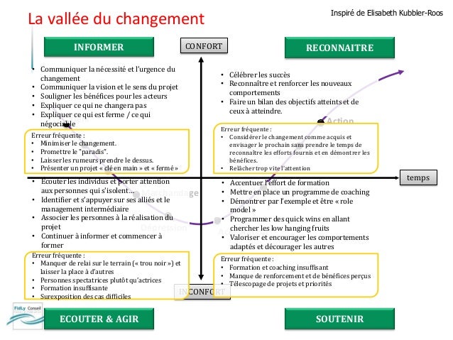 Néanmoins, une conduite du changement menée de l’intérieur, par des personnes connaissant bien l’entreprise et son métier, et connues par les salariés, reste tout de même souvent la meilleure solution en termes de coûts et de délais Mais encore fautil disposer en interne des compétences et des ressources nécessaires. UÊ Une littérature très pragmatique qui décrit les outils de conduite du changement à mettre en place, tels que le plan de communication par exemple Notre objectif dans cet ouvrage n’est pas de faire une thèse théorique sur le concept de changement mais de rechercher dans la littérature les concepts. La conduite du changement (aussi appelé accompagnement au changement) consiste à guider un projet d’organisation ou de réorganisation d’une entreprise pour qu’elle s’adapte à l’évolution de son environnementElle est parfois nécessaire d’être mise en oeuvre pour une société qui mène un projet de transformation organisationnel ou qu’elle déploie de nouveaux outils.