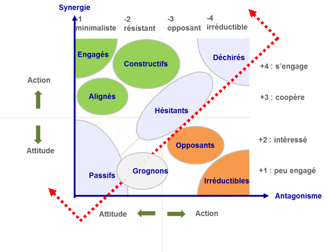 Le plan d’engagement peut être représenté sous la forme d’une matrice Excel avec en ligne les parties prenantes et dans les colonnes les informations et les éléments à suivre identification, nature de l’impact du changement, niveau d’engament actuel (non embarqué, sceptique, frein, spectateur, impliqué, engagé) et la cible. Mais tout de même, lorsque l’on travaille sur un plan de communication et conduite du changement pour porter une grande évolution de l’entreprise, si l’on ne s’attarde pas suffisamment sur les revendications des détracteurs ou sur les craintes des utilisateurs, on passe à côté de l’enjeu principal qui sera de faire comprendre au plus grand nombre pourquoi ce sera mieux après !. Un plan de conduite du changement doit être ainsi défini en détail Ces derniers exemples sont la preuve que sans une conduite de changement menée avec finesse, les conséquences sur le devenir d'une entreprise peuvent mener à des évolution non voulues ou à de graves difficultés et dans le cas contraire à une réussite totale menée en.