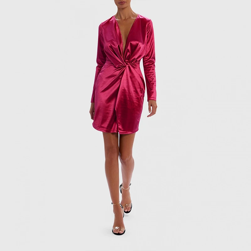 Hot Pink Kylie Jenner Style Satin Long Sleeve Knot Front Wrap Party Women Dresses Online Buy Long Sleeve Dress Satin Dress Women Dresses Product On Alibaba Com