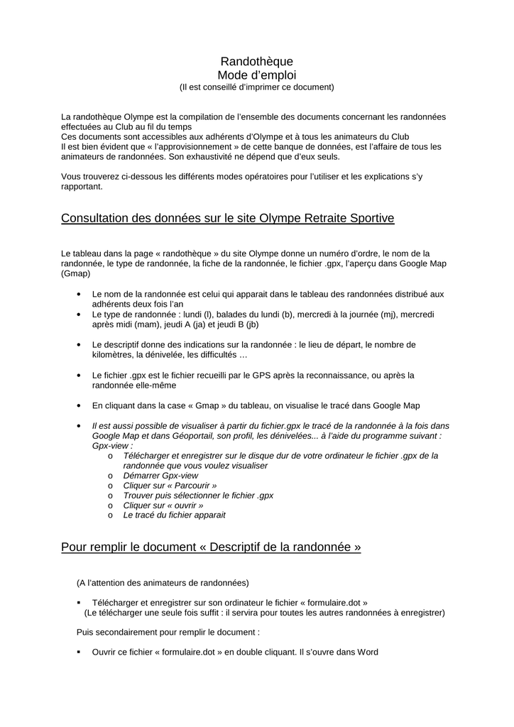 La Retraite Sportive de MaisonsAlfort un club multisports pour les plus de 50 ans Les bienfaits de la pratique d’un sport ou d’une simple activité physique sur la vitalité , le mieuxêtre et la qualité de vie au quotidien ne sont plus à démontrer. OLYMPE RETRAITE SPORTIVE 160 Av Du Languedoc Nimes Siret 448 036 442. Randonnées A et B du jeudi Olympe Retraite Sportive READ Saison 1213 2 ème semestre PROGRAMME des SORTIES JEUDI A et B Dates Itinéraires / lieu de départ 07/02/13 Jeudi A départ 8 heures parkings COSTIERES ou CASTANET Jeudi B départ 8 heures 30 parkings PARNASSE ou CASTANET Départe ment.