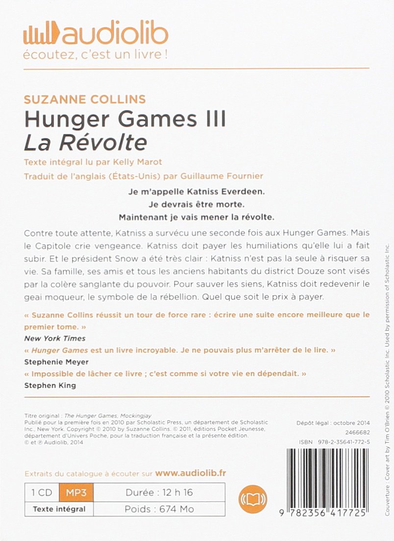 Hunger Games Iii La Revolte Livre Audio 1 Cd Mp3 Audio Book Hunger Games 3 French Edition Suzanne Collins Lu Par Kelly Marot Audio Amazon Com Books