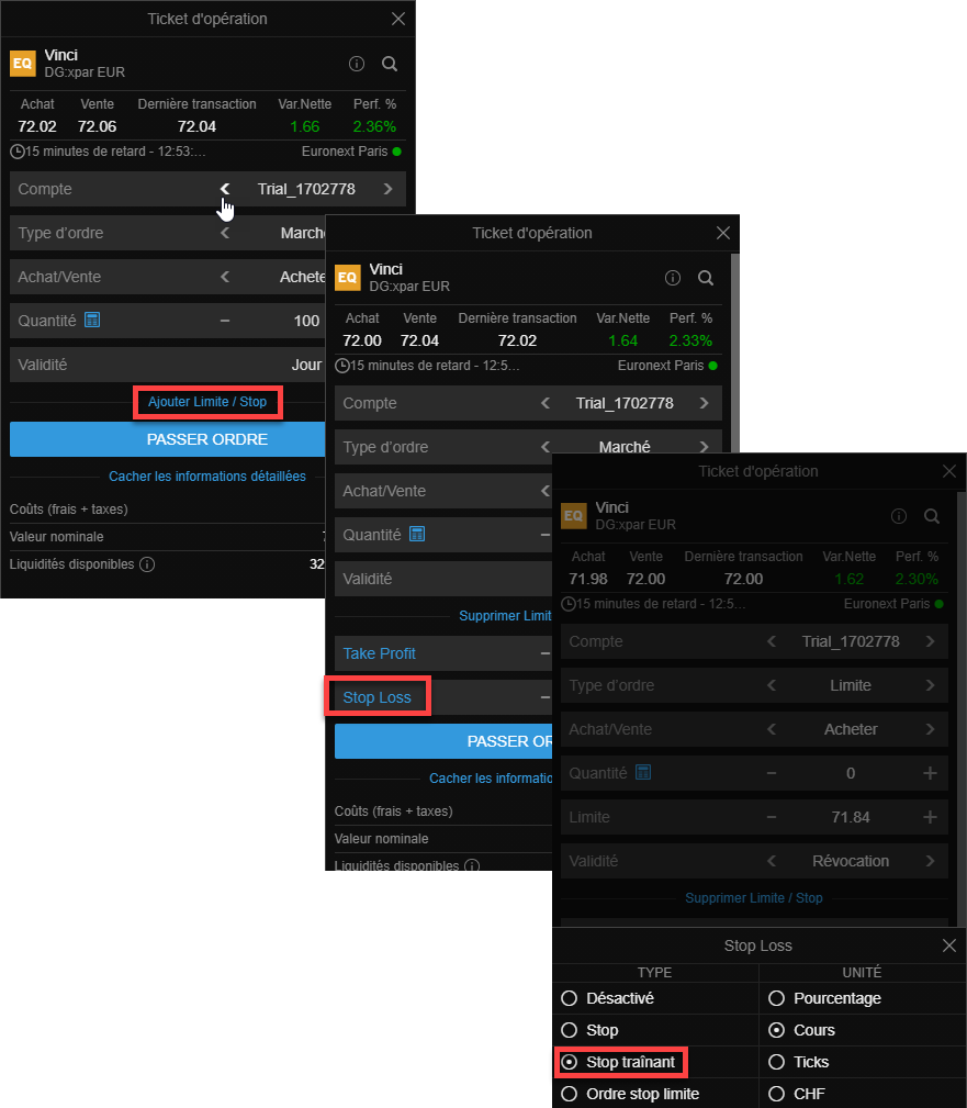 I'd be interested to see a use case and how it works with/without the stop loss trigger It doesn't have to be your strategy, but perhaps one that wins big, but also loses big This comment has been minimized. Ordre stop suiveur un ordre stop dynamique Audelà de l’ordre stop loss classique, qui vise à limiter la perte encourue, existe l’ordre stop suiveur ou trailing stop en Anglais, aussi appelé take profit, qui consiste à maintenir un écarts de points entre le cours de l’actif et le niveau de stop loss L’intérêt du stop suiveur L’intérêt de cet outil est d’éviter les. Suiveur l’ordre «suiveur» (ou stop suiveur) permet d’ajuster le prix d’exécution de l’ordre à seuil de déclenchement selon l’évolution du cours de Bourse Exemple, vous passez un ordre de vente «suiveur» à 5% du dernier cours Si le cours progresse, la limite d’exécution remontera pour se maintenir à 5% du dernier cours.