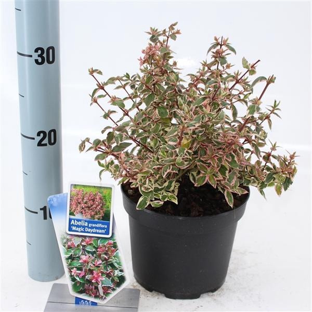 Glossy abelia (A x grandiflora), the most common garden species, produces shiny semievergreen leaves in colder zones, while retaining yearround color in warmer regions Newer hybrids are bred for unique foliage color, showier flowers and compact sizes more suitable to small urban lots. Abelia gr ‘Magic Daydream’ A highly attractive and compact semideciduous mini shrub with bright white foliage The edges of the laeves turn purplepink in the autumn. Abelia grandiflora 'Magic Daydream' is a deciduous evergreen shrub that produces clusters of funnelshaped flowers throughout the autumn This compact shrub grows dark green foliage that change colour throughout the year A highly fragrant and attractive option for planting in your beds, borders, and containers.