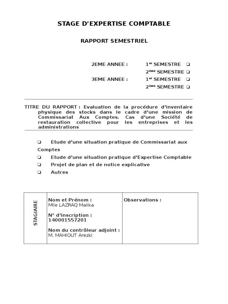 Stage D Expertise Comptable Rapport Semestriel Inventaire Comptabilite