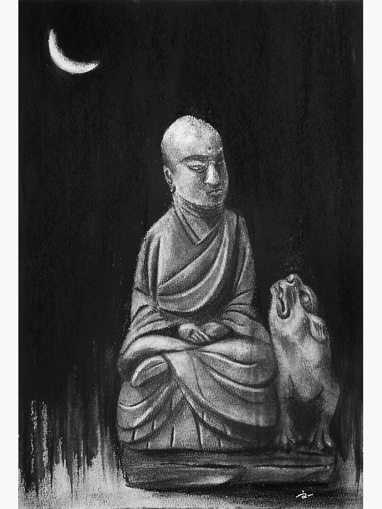 Lamina Rigida Dibujo Al Carboncillo Un Pequeno Monje Y Su Bestia Bajo La Luz De La Luna De Iswenyi Redbubble
