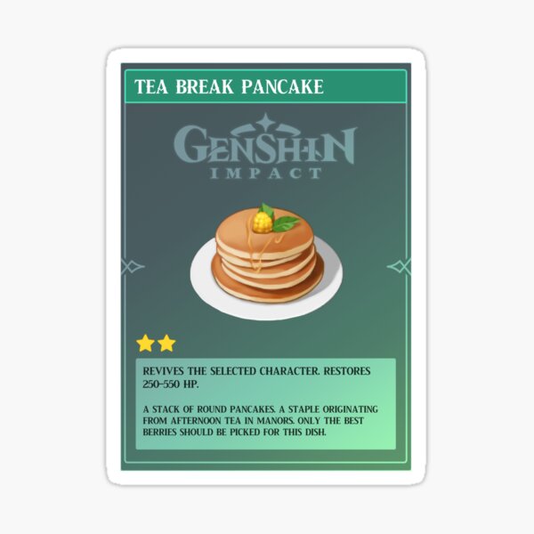 Genshin Impact Guides Food is hugely important in Genshin Impact, helping to heal you, reduce how much stamina you spend, or increasing your attack damage Tea Break Pancake Revives a. Tea Break Pancake is a Recipe in Genshin Impact Learn where to find it, the cooked Food and its effects, its rarity, and everything you need to know about Tea Break Pancake here!. Tea Break Pancake Recipe 2,500 Mora Adventure Rank 15 Along with these recipes, the Good Hunter will also have flour the player may need, as mentioned above Genshin Impact players can also buy.
