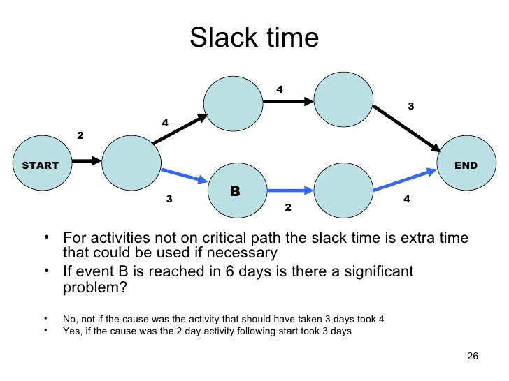 Slack time, used in Program Evaluation and Review Technique (PERT), denotes how much an activity can be delayed beyond its earliest start date, without causing any problems in the completion of the project by its due date Also known as float, slack time is applicable only to those activities which do not lie on the critical path of the PERT chart. Slack time is defined as the temporal difference between the deadline, the ready time and the run time More formally, the slack time s {\displaystyle s} for a process is defined as s = ( d − t ) − c ′ {\displaystyle s=(dt)c'}. If not, you’re missing out A 15 survey indicated that teams using Slack experienced some big benefits.
