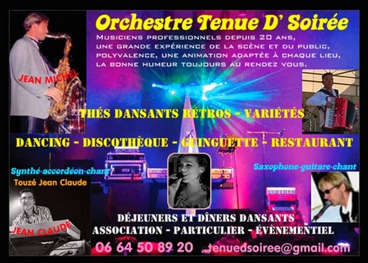 Orchestre Tenue D'Soirée Contact Touzé Jean Claude Tél 06 64 50 , mail tenuedsoiree 01 @gmailcom ATTENTION ne pas écrire le 01 site internet 1 à 4 musiciens Le Planning de l'orchestre est en dessous Saisir vos DISPONIBILITÉS ici. « Nous ne sommes plus qu’une minorité à faire le métier dans les règles de l’art en déclarant nos musiciens, alors qu’il se trouve une trentaine d’orchestres en France, affirme Pascal Douzet, qui nous assure que n’importe qui peut se prétendre chef d’orchestre en FranceLe reste fait n’importe quoi en se faisant payer 4 500. Un statut cadre pour le chef d’orchestre ?.