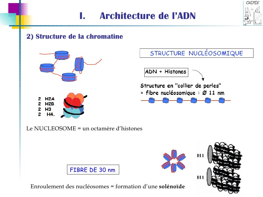 Lorsque les nucléosomes se lient aux filaments d'ADN sous forme de sousunités répétées, l'ADN subit une transcription active le processus par lequel l' ADN est converti en ARN La structure des. Re Fibre nucléosomique Message par Akirombre » 03 octobre 16, 0910 Je pense pouvoir confirmer clemirou (en précisant juste que un nucléosome = perle = octamère d'histones ADN). Re Fibre nucléosomique Message par Akirombre » 03 octobre 16, 0910 Je pense pouvoir confirmer clemirou (en précisant juste que un nucléosome = perle = octamère d'histones ADN).
