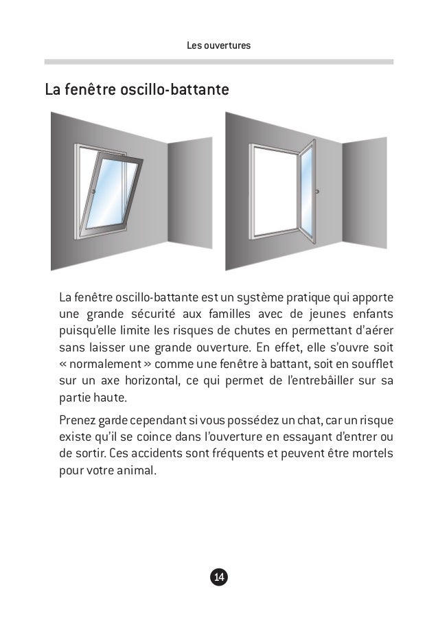 Il permet l’ouverture dite à la française, sur un axe vertical et une entr’ouverture sur un axe horizontal en bas de fenêtre Le battant permet au vantail de s’ouvrir sur sa partie haute, vers l’intérieur de l’habitation Une aération sécurisée. La fenêtre coulissante est idéale pour gagner de la place puisque le vantail coulisse dans l’axe d’un rail fixé au sol Elle convient par exemple audessus de l’évier d’une cuisine ou pour la conception de grandes baies vitrées Sachez que la partie coulissante peut recouvrir un autre vantail ou s’intégrer complètement dans le mur, dans lequel elle disparaît. La fenêtre oscillobattante Ce type d’ouverture oscillant battant est un dérivé de l’ouverture dite « française » L’ouverture oscillobattante apporte ainsi une double possibilité d’ouverture Vous pouvez soit l’ouvrir sur un axe vertical comme une fenêtre à la française soit l’ouvrir sur un axe horizontal par le haut dans le but d’aérer la pièce plus modérément.