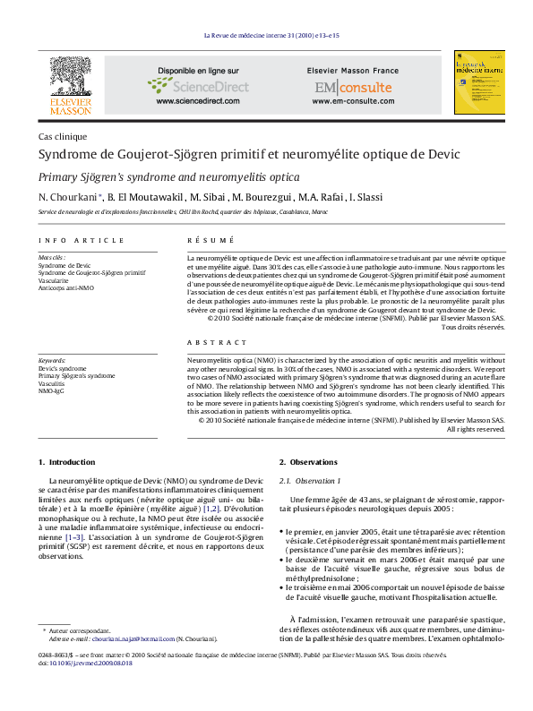 Syndrome De Goujerot Sjogren Primitif Et Neuromyelite Optique De Devic Sciencedirect
