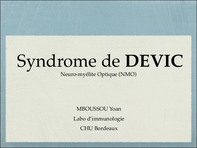 Neuromyelitis optica (also known as Devic's disease) is an idiopathic, severe, demyelinating disease of the central nervous system that preferentially affects the optic nerve and spinal cord Neuromyelitis optica has a worldwide distribution, poor prognosis, and has long been thought of as a variant of multiple sclerosis;. A case of classic neuromyelitis optica (Devic’s syndrome) triggered by pegylatedinterferon αpdf even though its si de effects are so metimes un predictab le and severe. Neuromyelitis optica – Devic’s syndrome, update Antibody to aquaporin4 in the longterm course of neuromyelitis optica Mult Scler, deivc, pp Antiaquaporin4 AQ4 antibodies are a specific biomarker of the entity and, since their discovery, both the number of symptoms and the radiological data about the disease have progressively increased, and the concept of clinical spectrum of NMO.