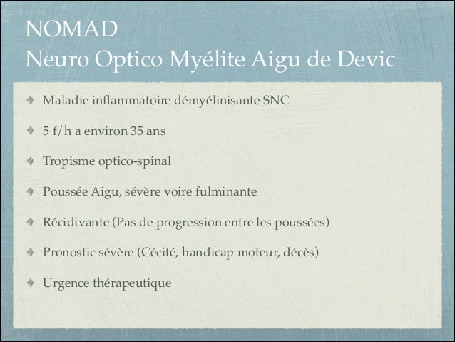 Neuromyelitis optica is an autoimmune disorder that affects the nerves of the eyes and the central nervous system, which includes the brain and spinal cord Explore symptoms, inheritance, genetics of this condition. La enfermedad de Devic, también llamada neuromielitis óptica (NMO) (o espectro de trastornos NMO), es una alteración neurológica considerada rara, que afecta entre 1 y 9 personas de cada Se trata de una enfermedad inflamatoria autoinmune y desmielinizante, que afecta principalmente a la mielina del nervio óptico y a la médula. La neuromyélite optique aiguë de Devic (neuropticomyélite, maladie de Devic) La neuromyélite optique de Devic (DNMO) est une affection inflammatoire démyélinisante du système nerveux central, qui touche préférentiellement la moelle épinière et les nerfs optiques Il s'agit d'une pathologie rare et les données épidémiologiques manquent.