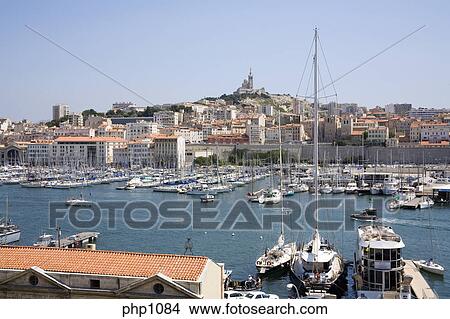 El Puerto Viejo En Marsella Con Basilica Notre Dama De La Garde En El Distancia Foto Php1084 Fotosearch
