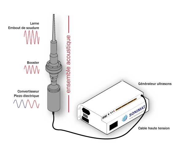 Ensemble acoustique pour la soudure par ultrasons Le générateur convertit la fréquence électrique du réseau (50/60 Hz) en énergie électrique de haute fréquence correspondant, sur ce schéma, à 000 Hz Le convertisseur piezoélectrique (ou transducteur) transforme les 000 Hz électriques en vibrations mécaniques de même fréquence L’énergie devient alors mécanique. Contrôle Soudure par Ultrason Tout d’abord, le principe du “Contrôle Soudure par Ultrason” est de générer des ondes en partant d’un élément électrique Premièrement, la technique du contrôle est liée à une onde ultrasonore est émise. Puis une expertise de la soudure plastique portée aux autres technologies Fort de cette expérience unique dans l’assemblage thermoplastique par ultrasons, nous avons développé une gamme complémentaire pour répondre à l’ensemble de vos projets de soudure plastique soudure miroir ou lame chauffante, soudure infrarouge, soudure par rotation et enfin soudure laser.