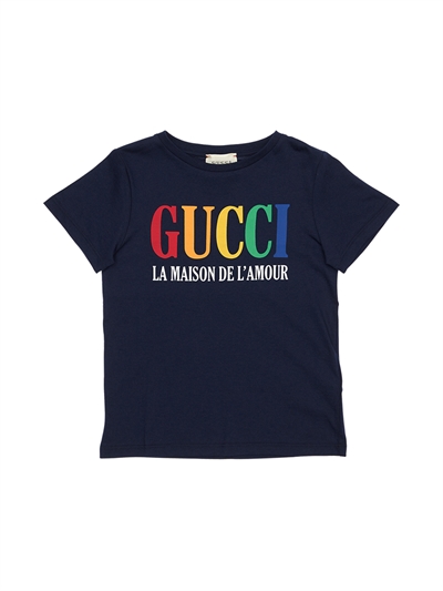 Gucci Kids Children's Tshirt with Gucci print Dark blue cotton jersey Rainbow Gucci logo and "La Maison de L'Amour" print, inspired by the men's and women's readytowear collection. Gucci maison de l'amour cotton sweatshirt € 1000 ★. Gucci "Maison de l'Amour" and "Sine Amore Nihil" sartorial label on the back;.
