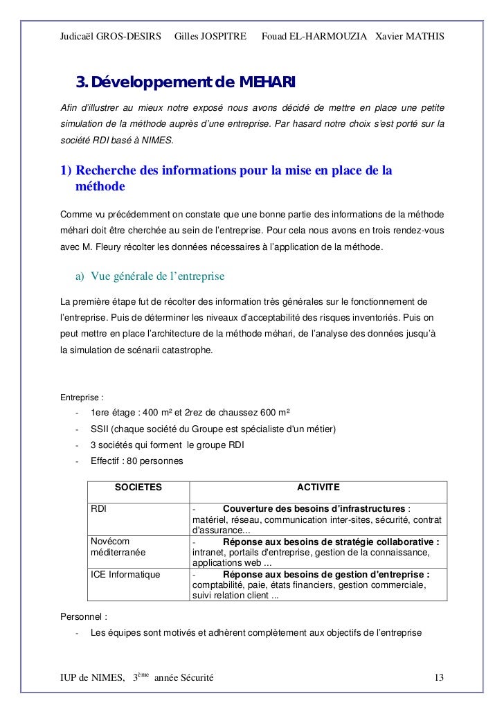 Politique de sécurité => Impacts si dysfonctionnement La méthode MEHARI Classification Actifs Processus majeurs => Seuils de gravité / impact => Identification des ressources => Classification des ressources Disponibiliré Intégrité Confidentialité Charte de management Plan. Etude d’une methode d'analyse des risques La méthode MEHARI Stephane N Clinton INTRODUCTION L'objectif de la sécurité de l'information est la mise en oeuvre des solutions de sécurité permettant d'assurer la réduction des risques à un niveau tolérable pour l'entreprise. Created the MEHARI method and it complies with the requirements and standards’ guidelines for the security of the information systems simplified model is presented in Section 21 In this paper, the FoMRA model described in 13, will be a subject of the comparative analysis aiming, as mentioned above, to demonstrate the correctness of.
