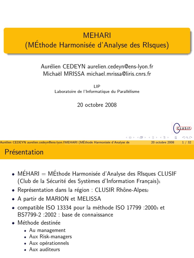 Mehari Expert is also available in French and in Farsi;. MEHARI demeure une des méthodes d´analyse des risques les plus utilisées actuellement Elle est dérivée de deux autres méthodes d´analyse des risques (MARION et MELISA) Cette méthode se présente comme une véritable boîte à outils de la sécurité des SI, permettant d´appréhender le risque de différentes manières au sein d´une. Conférence CLUSIF "MEHARI 10" Gérer ses risques avec la norme ISO et MEHARI.