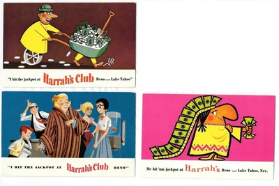 Lot Of 3 1950 S Harrah S Reno Tahoe Hit The Jackpot Postcard Indian Mink Cash Ba Ebay