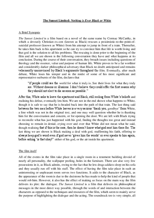 In terms of tone and presentation, “Sunset Limited’s” closest kin would be less “My Dinner With Andre” than “‘night, Mother,” another play turned movie with suicide as a theme In TV terms, that’s. HBO, Sat Feb 12, 9 pm Production Filmed in Santa Fe by Javelina Film Co and presented by HBO Films Executive producer, Tommy Lee. Sunset Limited Summary Of Christians and Culture Junkies The play begins shortly after Black has saved White, a professor, from committing suicide He attempted to jump in front of a commuter train, the Sunset Limited of the title To be clear, the two characters are identified by their respective races rather than their names.
