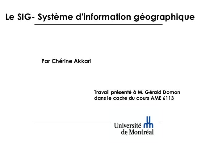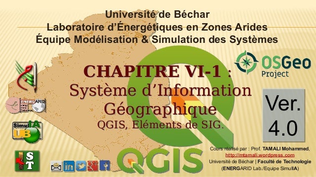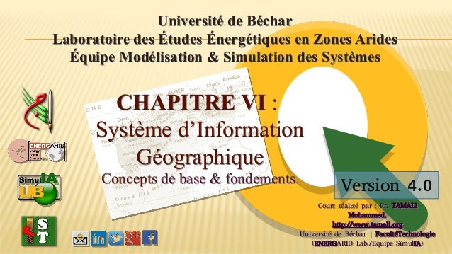 L’intégration de la composante géographique dans certaines tables de la base de données a conduit à la formation d’un système d’information géographique (SIG) des ressources en eau de. Cours en ligne de l’École Nationale des Sciences Géographiques (ENSG) Les supports de cours pour l'introduction aux systèmes d'information géographique (ArcGIS, QGIS) et au système de gestion de base de données relationnelles (PostGIS) sont disponibles ici Outils Quantum GIS Quantum GIS est un logiciel de SIG libre et multiplateforme. Un système d'information géographique ou SIG (en anglais, geographic information system ou GIS) est un système d'information conçu pour recueillir, stocker, traiter, analyser, gérer et présenter tous les types de données spatiales et géographiques L’acronyme SIG est parfois utilisé pour définir les « sciences de l’information géographiques » ou « études sur l’information.