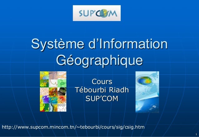 Systeme d information geographique cours. Présentation générale des Système d'Information Géographique;. Système d’Information Géographique Cours Tébourbi Riadh SUP’COM 06 http//wwwsupcommincomtn/~tebourbi/cours/sig/csightm 11Cours SIG, Tébourbi Riadh, 06 SIG (GIS) définition (1) Ensemble de principes, de méthodes, d'instruments et de données à référence spatiale utilisés pour saisir, conserver, transformer, analyser, modéliser, simuler et cartographier les phénomènes et les processus distribués dans l'espace géographique. Systèmes d’Information Géographique Enseignant Clélia Bilodeau Clélia Bilodeau Clélia Bilodeau Plan du cours • Généralités et concepts de base • Localisation de l’information dans l’espace • Les données dans un SIG • Interrogation Requêtes.