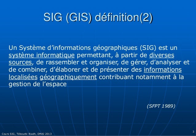 Un système d’Information Géographique est un outil informatique permettant de représenter et d’analyser toutes les choses qui existent sur terre ainsi que tous les événements qui s’y produisent Les SIG offrent toutes les possibilités des bases de données (telles. Un système d'information géographique (SIG) est un système d'information conçu pour recueillir, stocker, traiter, analyser, gérer et présenter tous les types de données spatiales et géographiques issues de la télédétection (observation des ressources terrestres et de leur utilisation par l'homme) Les applications sont multiples recherche du cheminement le plus économique en termes de temps pour la distribution du courrier par le facteur, du tracé dont l'impact sera le plus. Systèmes d’Information Géographique , Traiter et valoriser des données Systèmes d’Information Géographique , Traiter et valoriser des données géographiques grâce à l’informatique en hydraulique et environnement.